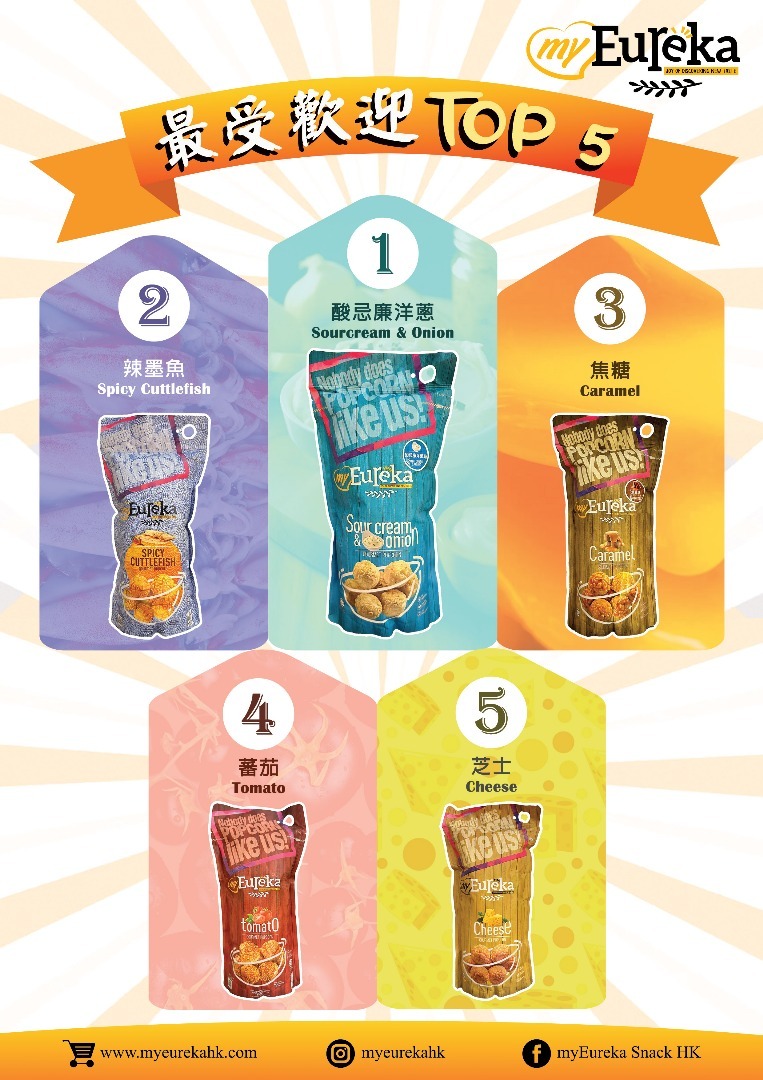 myEureka是一個在馬來西亞開始的故事,由幾位年輕人開創的爆谷品牌。這十幾年來用心經營並不斷創新找出最特別又最貼地的味道,改變了從前市場對爆谷的定位 - 爆谷可以是甜,可以是鹹,可以是酸辣,可以是無限想像。而且不過甜卻又非常香脆,不添加防腐劑卻能保存一年的包裝技術。由馬來西亞帶到世界各地,成為星馬最受歡迎的爆谷。